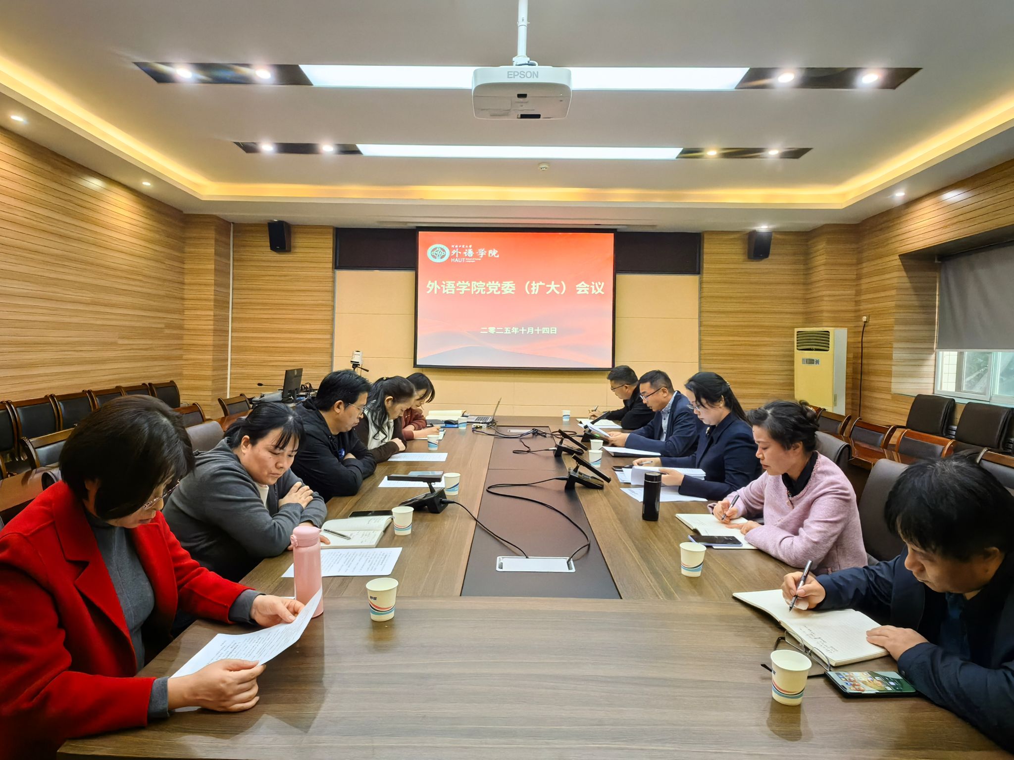 10 月 14 日,外语学院在 5231 会议室召开党委(扩大)会议。学院党委班子成员、各教工党支部书记参加会议,会议由院党委书记王云涛主持。