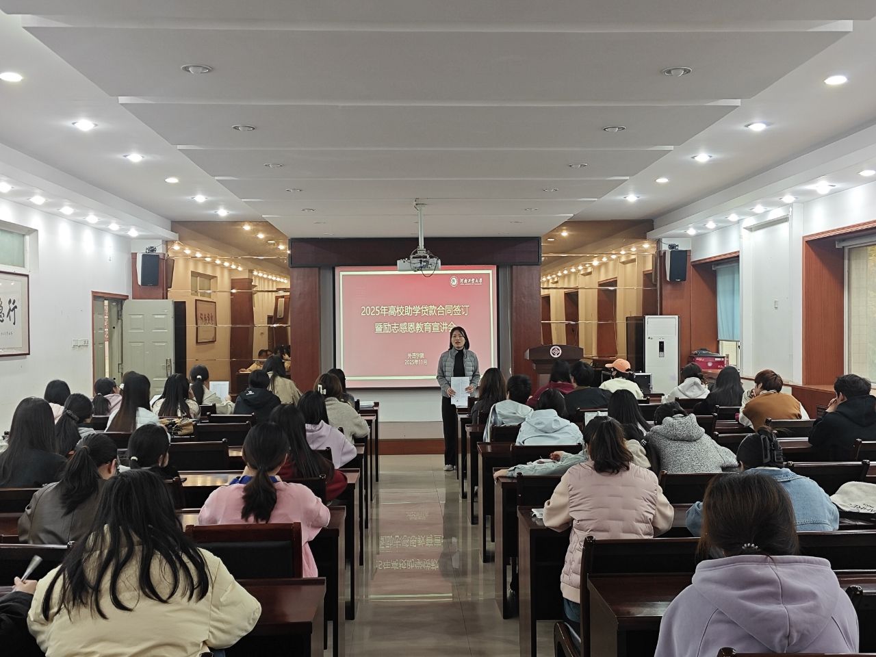 为贯彻落实高校资助政策,强化学生诚信履约意识,保障高校助学贷款工作的顺利开展,11月5日下午,外语学院在博闻楼5225会议室召开了2025年高校助学贷款合同签订暨诚信励志教育大会,学院学生资助工作负责人郭珊珊、资助助理及申请高校贷款的学生参加了本次会议。