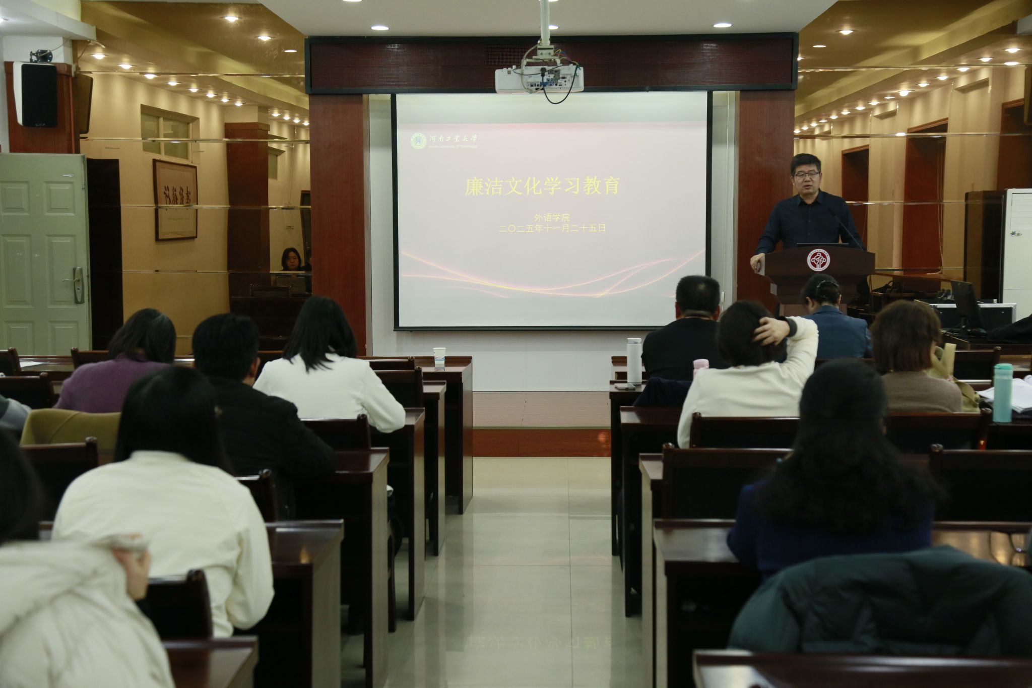 为筑牢全体教职工廉洁从教的思想防线,营造风清气正的育人环境,11月25日下午,外语学院在5225会议室召开全体教职工大会,专题开展廉洁文化学习教育。全体教职工参会,会议由院党委书记王云涛主持。