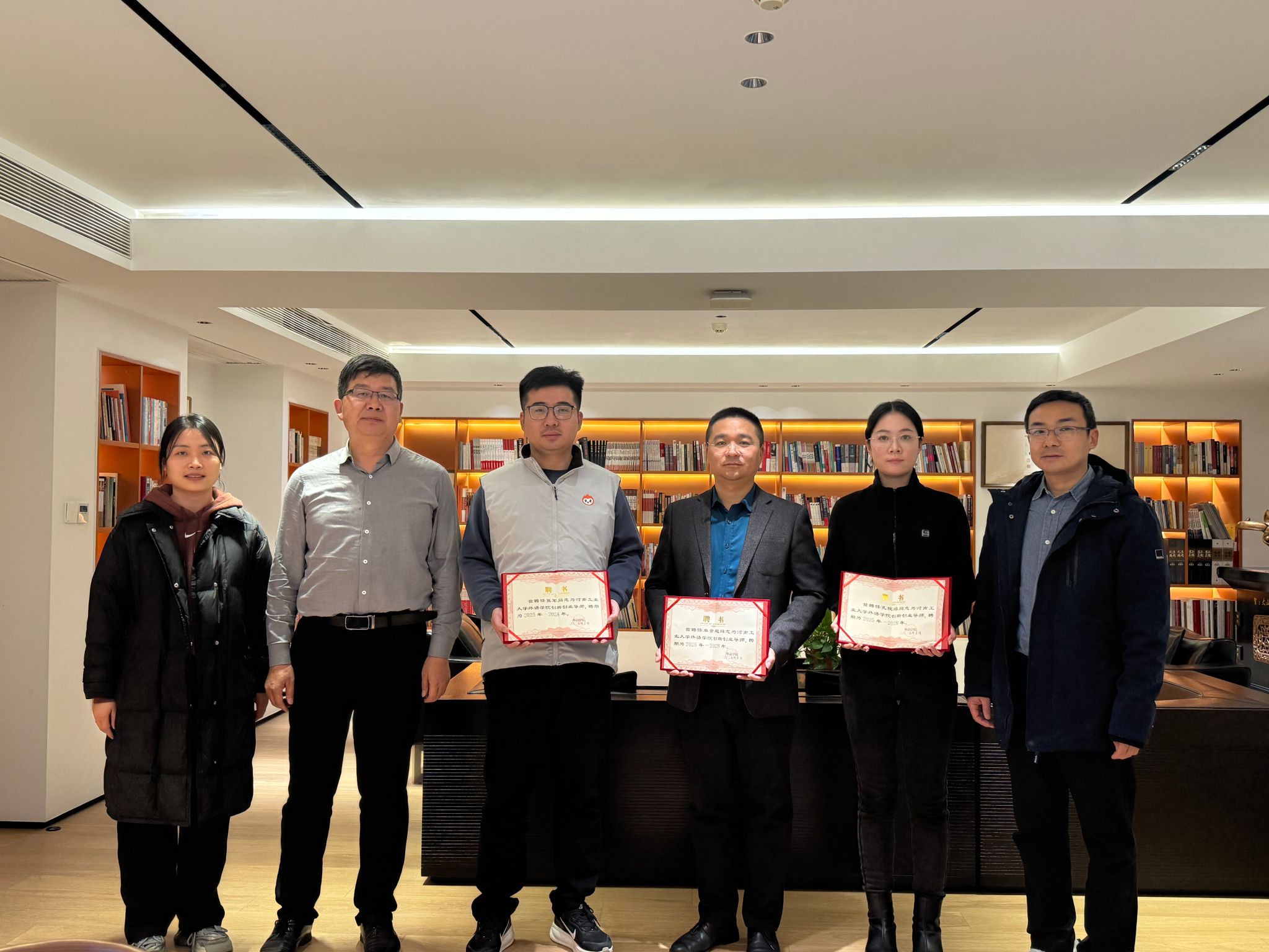 随后,王云涛和单景超双方共同为“创新创业基地”和“就业实习基地”揭牌。王晓东向单景超、张军和孔琬瑢颁发“创新创业导师”聘书。