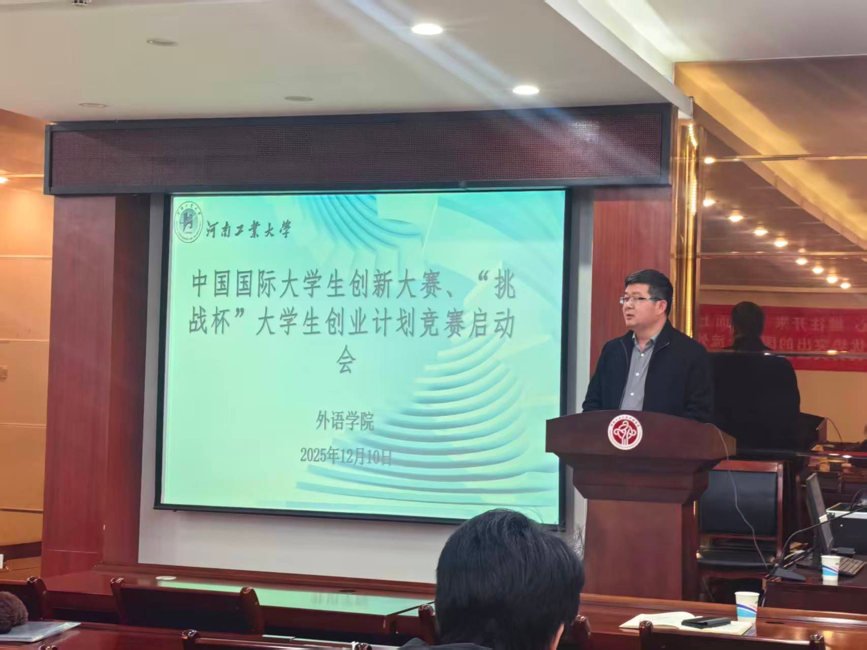 12月10日下午,外语学院在博闻楼5225会议室举办2026年“中国国际大学生创新大赛”、“挑战杯”大学生创业计划竞赛启动会,系统部署本年度“双创”竞赛工作,着力提升学生创新精神和实践能力。会议特邀中国青年创业导师王伟担任主讲,学院党委副书记王晓东、学工办主任郭珊珊、团队指导老师及各年级有意向参赛的学生共同参加。