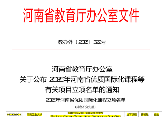 近日,河南省教育厅公布了2026年度河南省优质国际化课程立项名单。外语学院副教授蒋智敏主讲的《实用生活汉语:河南场景学中文》课程成功入选。这是学院在国际化课程建设方面取得的一项重要突破。
