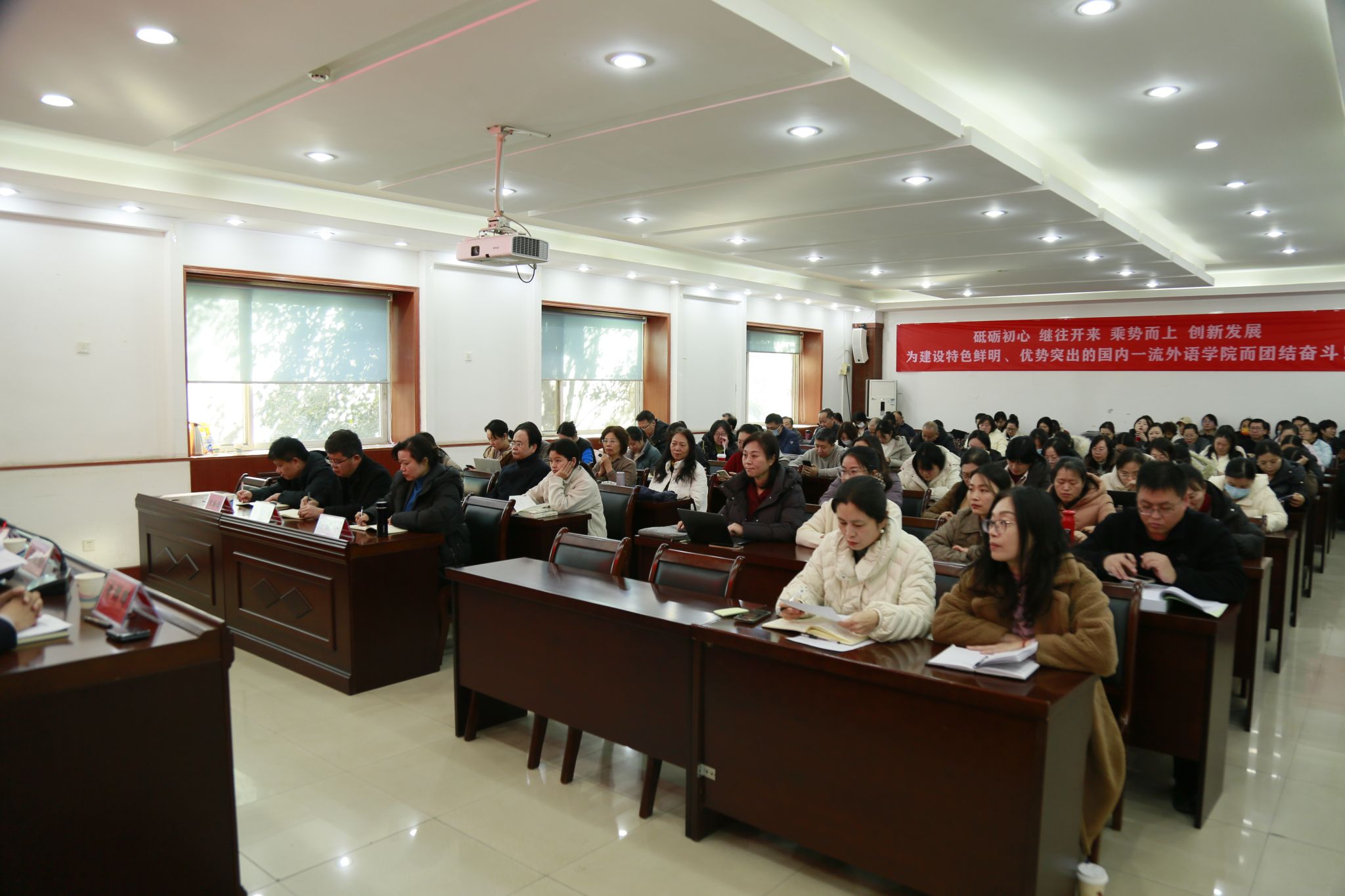 院长黄辉辉代表学院领导班子作述职报告,围绕党建引领、教学改革、学科建设、师资培训、人才培养、科研创新与社会服务等核心工作,全面总结了学院2025年度的发展成效。报告指出,在学校党委、行政的坚强领导下,学院凝心聚力、真抓实干,各项事业实现跨越式发展:学科与专业排名稳步提升,英语、翻译专业跻身全省前列;师资队伍建设成果显著,教师在国家级、省级教学竞赛中屡获佳绩;课程建设实现突破,成功获批省优质国际化课程,填补相关领域空白;科研创新能级大幅提升,年度获批国家社科基金项目数量创历史新高,其中中华学术外译项目实现学校该类项目零的突破,著作出版、论文发表及科研经费均创新高;人才培养质量持续提升,本科生升学率位居全校文科学院首位,学生在各级各类竞赛中斩获多项奖励。黄辉辉表示,成绩的取得离不开全院教职工的同心同德与辛勤付出。她强调,当前人工智能浪潮带来新挑战,2026年作为“十五五”规划开局之年,希望全体教职工以定力、智慧与锐气应对变革,在危机中育新机、于变局中开新局,携手共创学院发展新局面。