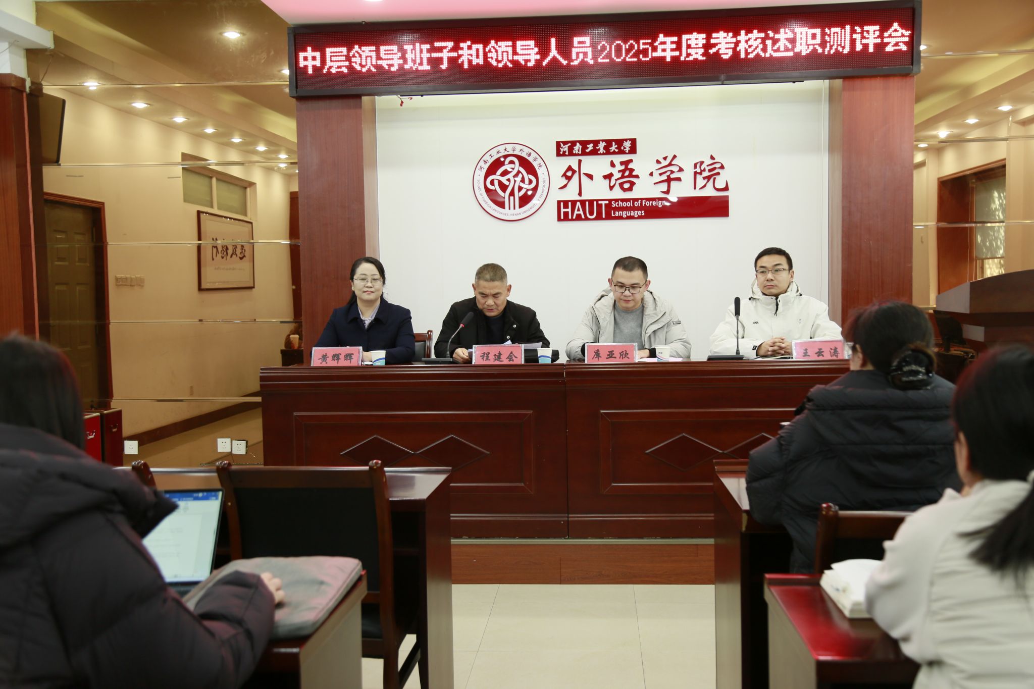 根据学校统一部署,1月6日下午,外语学院在5225会议室召开2025年度中层领导班子和领导人员考核述职测评会。校正处级组织员程建会、人事处综合科科长库亚欣一行莅临学院组织开展领导班子考核民主测评工作,学院班子和全体教职工参加会议。