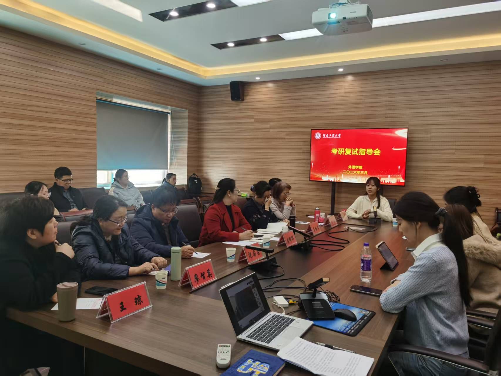 为深入学习贯彻关于树立和践行正确政绩观的重要论述,将正确政绩观内化于心、外化于行,切实体现在服务学生成长成才的实际工作中,外语学院紧紧把握2026届毕业生考研复试的关键节点,于3月9日下午在5231会议室组织开展研究生复试模拟演练活动。学院院长黄辉辉、党委副书记王晓东、副院长沈国荣、葛丽萍,以及各系部专业教师代表担任模拟复试评委,全体2026届考研上线学生参与活动。本次活动采取线上线下相结合的方式开展,由辅导员郭珊珊主持。