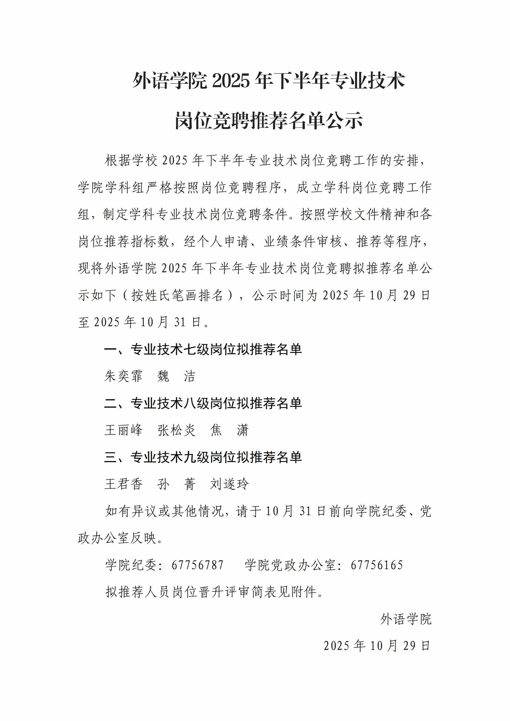 外语学院2025年下半年专业技术岗位竞聘推荐名单公示